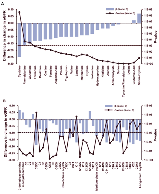 图1 氨基酸谱(A)和酰基肉碱谱(B)与6年前后肾功能(eGFR)改变的关联关系