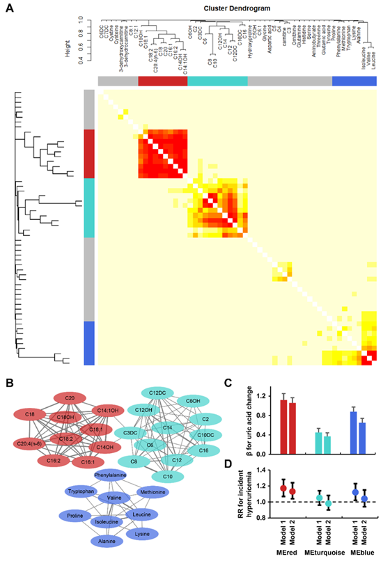 图2 氨基酸和酰基肉碱谱的网络分析:(A)网络分析热图;(B)三个代谢物网络模块示意图;(C)代谢物模块与6年前后尿酸改变关系;(D)代谢物模块与6年新发高尿酸血症关联关系