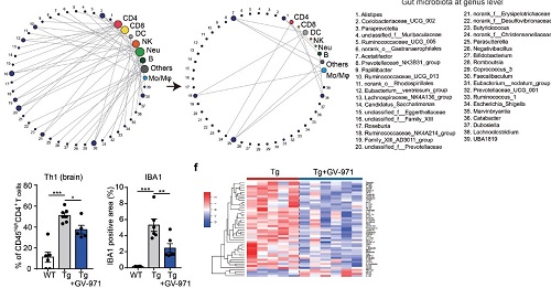 那么GV-971的作用机制是什么呢?作者进一步探究了GV-971是否通过影响肠道菌群进而影响AD进程。作者发现5XFAD转基因小鼠(Tg)口服GV-971一个月后,肠道菌群的组成更接近于野生型小鼠,且肠道菌群的分布发生了明显的双向变化。与肠道菌群的变化一致,GV-971治疗Tg小鼠后,之前脑内免疫细胞与肠道菌群间的相关性被打破,脑内促炎性Th1细胞比例下降,小胶质细胞的活化水平也显著降低,同时,脑内多种细胞因子水平广泛下降(图3)。并且,GV-971的治疗显著降低了Tg小鼠脑内Aβ斑块沉积和Tau蛋白的磷酸化,对Tg小鼠辨别学习能力也有明显的改善作用。这些结果表明,GV-971可以通过调节肠道菌群改善AD小鼠神经炎症和认知功能障碍。
