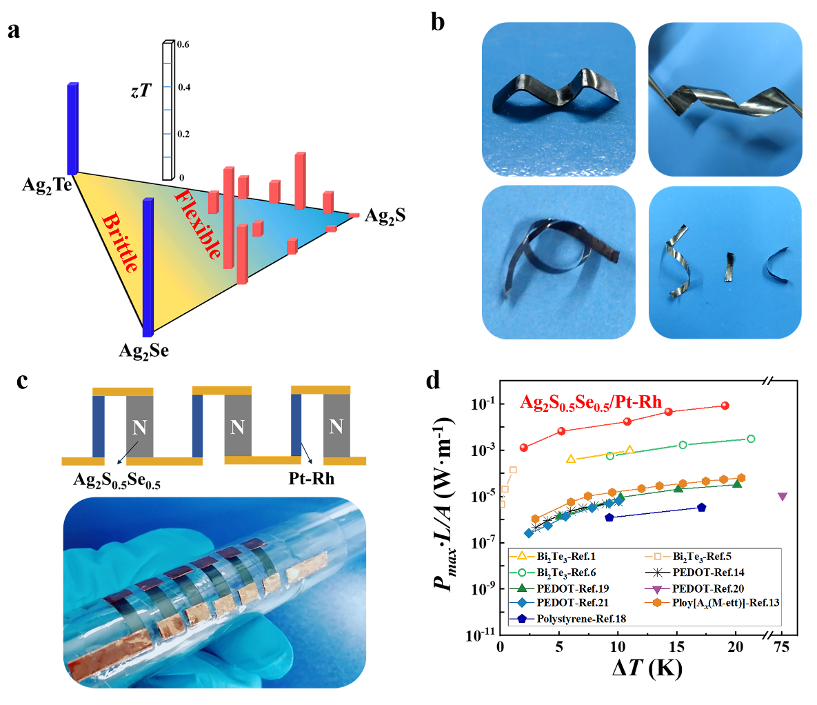 a) Ag2S-Ag2Se-Ag2Te体系的“塑性-zT”相图。b) Ag2S基柔性热电材料的优异力学性能。c) Ag2S基柔性热电器件的示意图和实物图。d) Ag2S基柔性热电器件和其它已报道的柔性热电器件的功率密度对比。