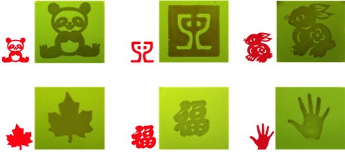 近日,该团队在Advanced Functional Materials上报道了一篇基于荧光高分子水凝胶的智能荧光响应、形状记忆和自修复等多功能协同以实现三维信息存储加密应用的新工作,题为“Three-Dimensional Fluorescent Hydrogel Origami for Multistage Data Security Protection”(DOI: 10.1002/adfm.201905514)。该工作利用苝四甲酸功能化明胶和聚乙烯醇水溶液的多次冷冻解冻循环获得高强度荧光高分子水凝胶,其表现出典型的Fe3+诱导荧光猝灭现象,用Fe3+溶液为“墨水”就可以在其上负载文字、图案等信息。此外,由于聚乙烯醇在硼砂溶液中易于形成高密度的动态硼酸酯键,该水凝胶也表现出优异的形状记忆和自修复性能。通过与中国传统的折纸技术相结合,该团队协同利用形状记忆和自修复性能,成功将负载了信息的2D水凝胶片“搭建”成形状各异的3D水凝胶信息载体,实现了基于荧光高分子水凝胶的三维信息存储和加密(如图4、图5)。