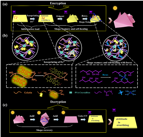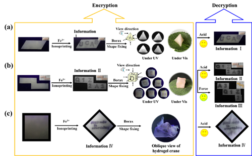 图5 (a-c)将分别负载“UCAS”、 “Q1A2Z3”、“Attitude is everything” 等信息的2D荧光水凝胶片手动折叠成各种三维形状后置于硼砂水溶液中,10s至3min后就可以得到形状各异的3D水凝胶信息载体。相较于经典的二维信息加密策略,这种加密于三维空间的信息的安全性更高,因为其负载信息只有在先置于酸溶液中恢复2D形状后才能在紫外灯下观察到(Adv. Funct. Mater. 2019, DOI: 10.1002/adfm.201905514)