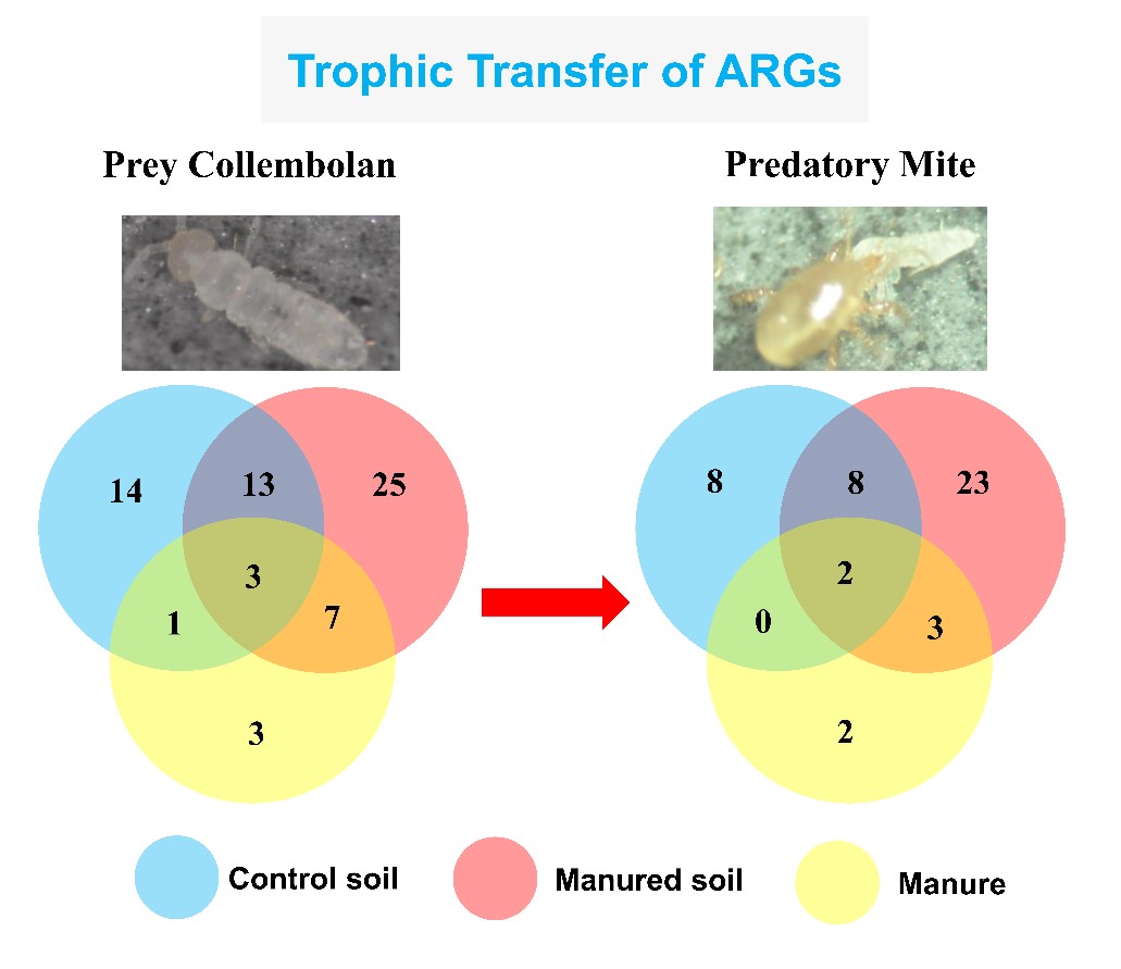 抗性基因(ARGs)的扩散与传播已经引起全球的关注,但我们对其在自然食物网和生态系统中传播的了解仍然有限,且ARGs的扩散可能受到食物网中动物及营养关系的重大影响。跳虫和捕食性螨是自然生态系统中最丰富的两种土壤小节肢类动物,在土壤食物网中占据着重要的营养级地位,在土壤生态过程中(如凋落物的分解和碳氮的循环)起着重要的作用。各种各样的食物(如猪粪,凋落物,细菌,真菌、原生动物和线虫等)能够被跳虫取食;同时,它自己也是各种捕食者(如捕食性螨)的猎物。捕食性螨对跳虫的捕食可能导致ARGs的营养级转移,增加捕食性螨中病原菌获得耐药基因的机会。然而,到目前为止,我们对土壤动物抗性组的认识还很不充分,更没有研究揭示捕食性螨微生物组中ARGs的丰度与多样性,以及粪肥对土壤食物链中ARGs营养级转移的影响。