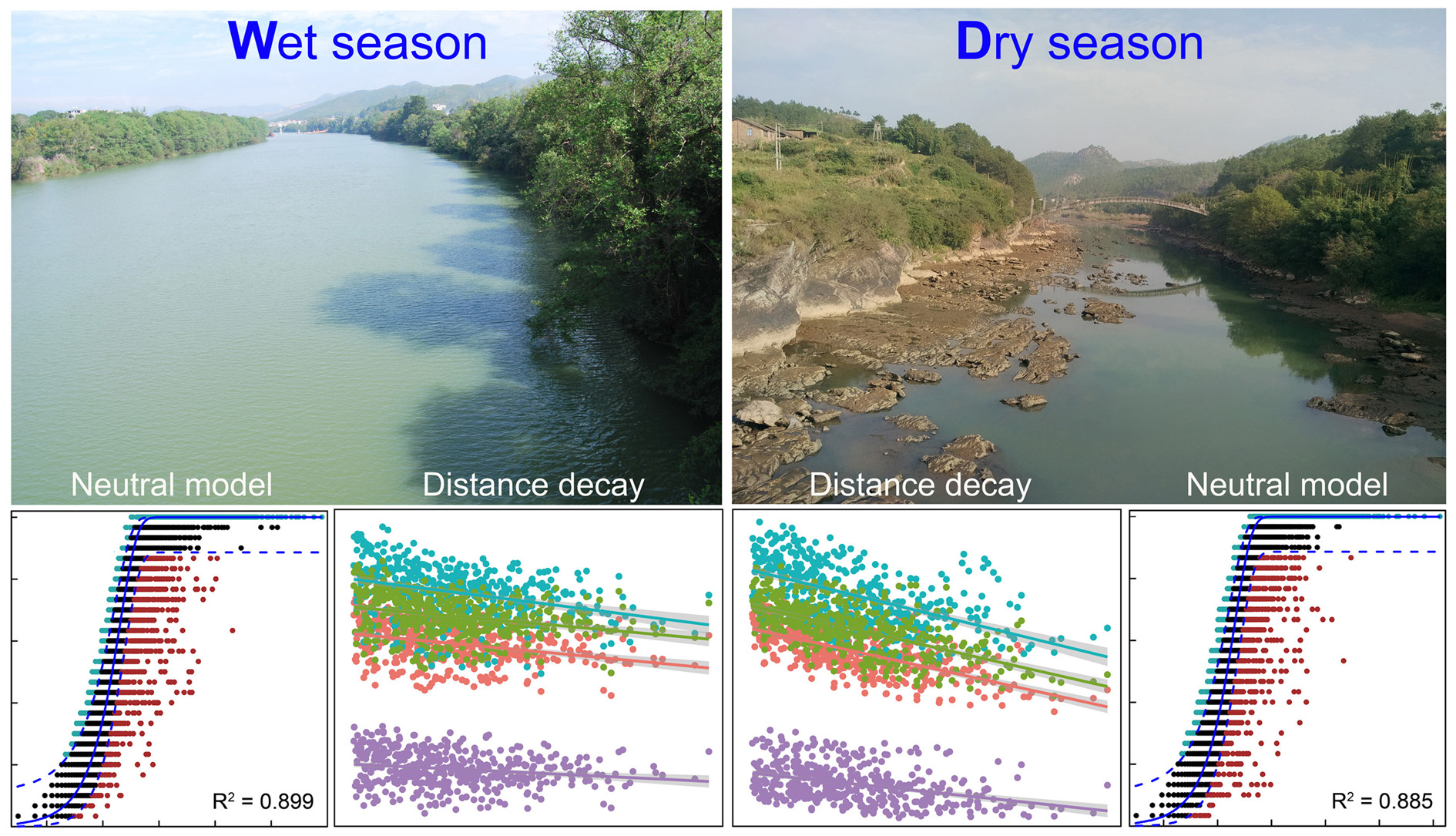 中国科学院城市环境研究所水生态健康研究组(杨军团队)以福建汀江浮游生物群落为研究对象,利用DNA宏条形码技术和多元统计方法对湿季和干季的微型真核浮游生物群落进行比较研究。结果表明,汀江真核浮游生物群落具有显著的时空差异,稀有种和优势种具有相似的地理分布格局;浮游生物群落的季节变化大于空间变化,值得注意的是干季(枯水期)生物群落的距离递减效应更强。进一步分析发现,随机过程主导了汀江浮游生物群落构建,湿季(丰水期)随机过程的相对贡献更大,不同分类阶元水平的群落构建具有相同的规律。群落中性模型显示,随机(中性)分布的物种和非随机分布的物种具有不同的多样性和生态特征。该研究揭示了不同水文条件下随机过程在河流浮游生物群落构建中的重要作用,为深入理解随机过程和确定性过程对水生生物群落构建的相对重要性提供了新思路;提高了我们对浮游生物稀有种群落构建和生态学机制的认知水平,为解析水生态系统结构和功能稳定性等问题提供了新视角。