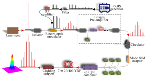 该项工作中,研究人员通过理论计算,得到了抑制SBS的最优谱线间隔,基于模型计算结果,相位调制信号的谱线间隔选择为布里渊增益带宽的0.5倍(12.7MHz),并选择带宽为DC-2.2GHz的射频低通滤波器来实现总带宽及包络控制。进而设计了四级掺镱光纤放大链路,将50mW单频激光器放大到1.27kW,后向反射率小于<0.1%,光束质量优良。该项工作为光纤激光器在5GHz线宽内实现数千瓦级功率放大提供了参考。