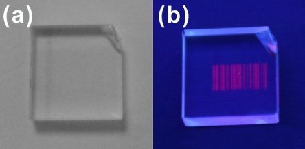 图1 超快激光在高羟基石英玻璃中写入的条形码图案在(a)日光下不可见,在(b)紫外光激发下发出红色荧光