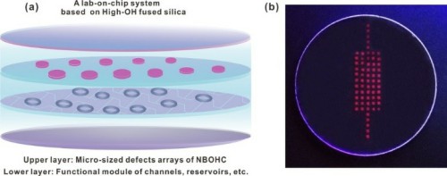 图2 (a)基于高羟基石英玻璃中的芯片实验室示意图,(b)超快激光在高羟基石英玻璃内部制备的非桥氧空穴中心红色荧光缺陷阵列
