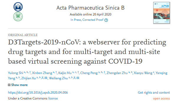 该项工作最早在今年2月11日发布于预印本网站ChemRxiv(https://doi.org/10.26434/chemrxiv.11831163.v1),并在近期正式发表于Acta Pharmaceutica Sinica B(DOI: 10.1016/j.apsb.2020.04.006),题为D3Targets-2019-nCoV: a webserver for predicting drug targets and for multi-target and multi-site based virtual screening against COVID-19。论文第一作者为中科院上海药物研究所研究生石禹龙,共同第一作者为张鑫贲、穆凯洁和彭诚,通讯作者为徐志建副研究员和朱维良研究员。