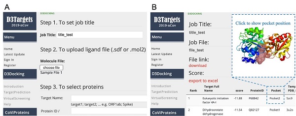 图1. D3Targets-2019-nCoV的输入界面(A)和输出界面(B)