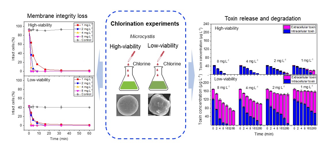 针对这个问题,中国科学院城市环境研究所饮用水生物安全研究小组选取典型的产毒蓝藻 (Microcystis aeruginosa FACHB-915) 作为实验材料, 在实验室条件下建立了该藻细胞完整的生命周期,并分别收集了高活性和低活性细胞用于氯化实验,研究了氯化对高活性和低活性细胞的膜完整性和藻毒素释放/降解的影响。结果表明,在初始氯剂量相同的情况下,低活性细胞的氧化剂暴露量低于高活性细胞,但低活性细胞对氯化反应的耐受性较差,导致其细胞膜破损速率和细胞内毒素释放率速率较高。此外,对于高活性细胞,氯氧化可以持续降低细胞外毒素,但是,低活性细胞的胞外毒素则持续增加,这主要是由于其胞外毒素降解速率低于胞内毒素释放速率。氯化(ct > 30 mg min L-1)可以完全降解高活性细胞的总毒素,而对于低活性细胞,即使氯暴露高达36 mg min L-1,氯化也不能完整去除毒素,这可能主要是由于胞外有机物对毒素降解的竞争性抑制作用。这些结果表明,氯化处理低活性藻细胞会在一定程度上增加藻毒素的安全风险,因此,在水源地连续蓝藻水华持续期间,不建议饮用水厂利用氯化处理处于蓝藻水华衰亡阶段的低活性藻细胞。