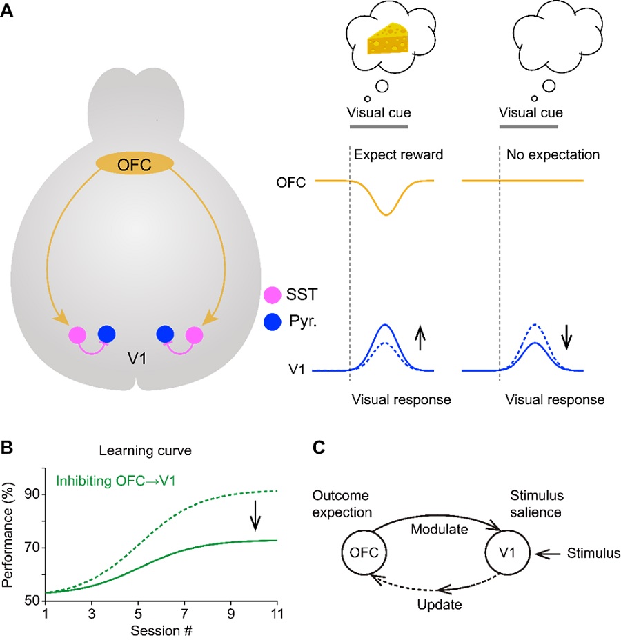 图注:A. 在刺激-奖励偶联行为中,OFC神经元的奖励预期信号通过反馈投射到V1,使得V1神经元对视觉刺激的反应受到奖励预期的调节。B. 抑制OFC向V1投射的活动,减慢视觉偶联学习。C. OFC的奖励预期信号对V1视觉反应的调节,改变了视觉刺激的显著度;V1视觉反应的变化,有助于OFC奖励预期信号的更新,从而促进学习。