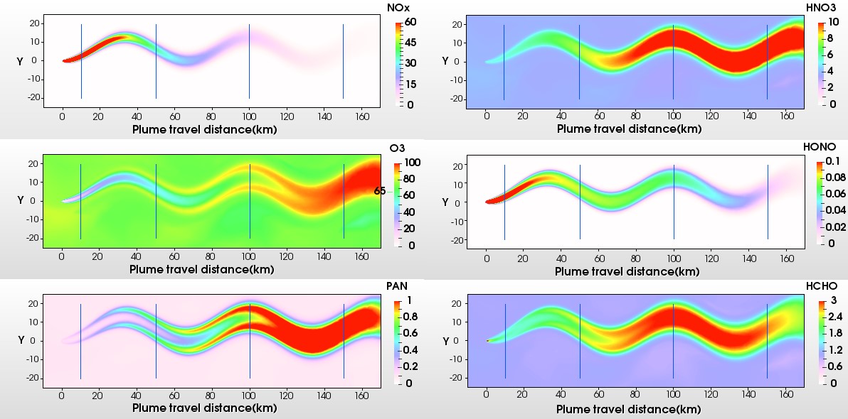 图2 在扰动的水平风场下,模拟得到的不同污染物NOx, O3, PAN, HNO3, HONO, HCHO的烟羽浓度分布,电厂点源的NOx源强为13.9 吨/小时