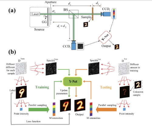 研究团队充分利用傅里叶变换关联成像系统的特点,提出了一种动态解码神经网络模型(Y-Net),只要训练过程和成像过程的散斑场统计特性一致,即可高质量重建样品图像,且样品只需单次曝光。由于网络具有动态解码特性,训练散斑场的空间分布可以完全不同于实验散斑场,因此可以采用模拟数据训练网络,从而解决了常规深度学习成像方法中的数据来源问题。此外,该方法基于端对端的方式实现样品图像重构,从而避免了傅里叶成像中的相位恢复问题。该方法对于实现高分辨X射线成像显微应用具有重要意义,将显著提升图像质量和成像速度,并有效减少辐射损伤。