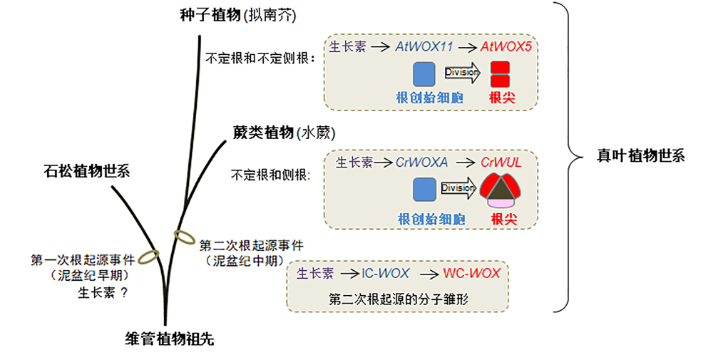 维管植物根的起源和进化还有着很多未解之谜。现存的维管植物是早期祖先两个世系的后代:真叶植物世系(包括蕨类植物和种子植物)和石松植物世系。化石证据显示,这两个世系中根器官的起源是独立事件:石松植物世系在泥盆纪早期出现了第一次根起源事件;真叶植物世系中蕨类植物和种子植物的共同祖先在泥盆纪中期出现了第二次根起源事件。虽然这项工作确认了生长素在真叶植物世系中控制根器管发生的保守分子功能,但石松植物世系中根发生的分子机制和生长素行为都还不清晰,这是将来研究的重要方向。