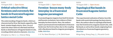 8月10日,Nature Communications在线背靠背发表了三篇对kagome金属性材料CoSn电子结构研究的论文。 [Liu et al., Nat. Commun. 11, 4002 (2002), Yin et al., Nat. Commun. 11, 4003 (2002), Kang et al., Nat. Commun. 11, 4004 (2002)] 三篇论文分别由上海微系统所,普林斯顿大学,麻省理工学院以及他们各自的合作团队完成。论文详细报道了在CoSn材料中发现的特征型kagome电子能带的性质,以及费米能级附近强电声耦合效应。