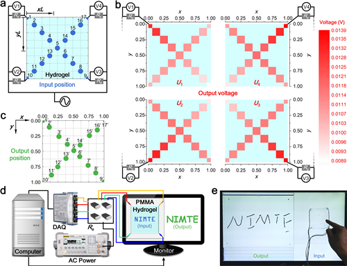 图3 2D水凝胶触摸屏:(a)触摸屏电路图和触碰位置(输入位置);(b)与触碰位置对应的V1、V2、V3、V4电压峰值;(c)由电压值算得的触碰位置(输出位置);触摸屏(d)集成于个人电脑系统,并(e)用于写字