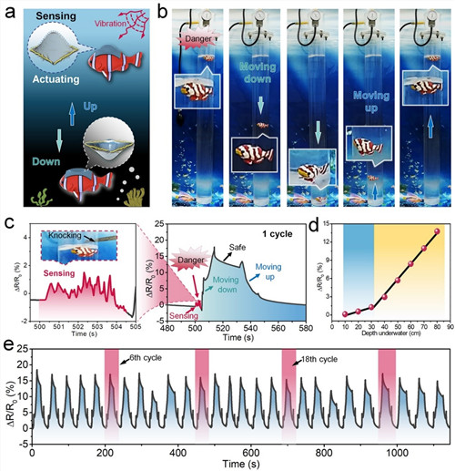 基于中国科学院宁波材料技术与工程研究所陈涛研究员课题组在柔性传感器和软驱动器方面的研究基础(Adv. Mater., 2020, 2004290; Nat. Commun., 2020, 11, 4359; Angew. Chem. Int.Ed., 2019, 58,16243; J. Mater. Chem. A, 2019, 7, 26631; ACS Nano, 2019, 13, 4368; Nano Energy, 2019, 59, 422; Adv. Funct. Mater., 2018, 28, 1704568; Chem. Mater., 2018, 30, 4343; J. Mater. Chem. C, 2018, 6, 5140; J. Mater. Chem. C, 2018, 6, 6666等)。近期,受到小丑鱼鱼鳔同时具有感知和变形驱动功能的启发,开发了一种水下自感知的软驱动器。