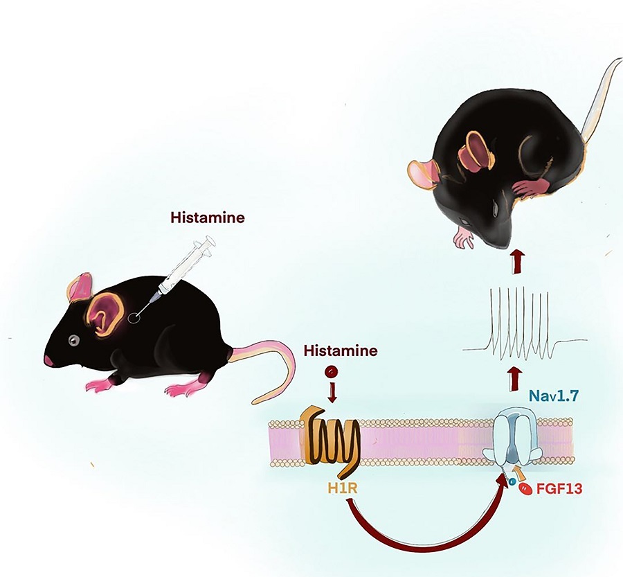 图注:小鼠皮内注射组胺(Histamine)后,组胺与DRG神经元上表达的组胺受体H1R结合后,激活胞内下游信号通路,通过电压门控钠离子通道NaV1.7产生动作电位,最终引发抓挠行为。胞内的FGF13与NaV1.7相互作用形成复合物,介导了NaV1.7产生动作电位和最终引发抓挠行为这些过程。