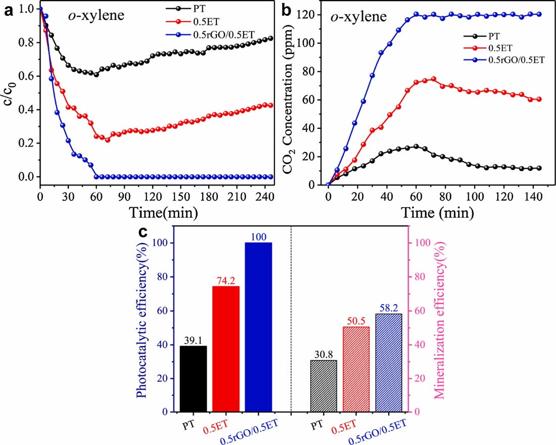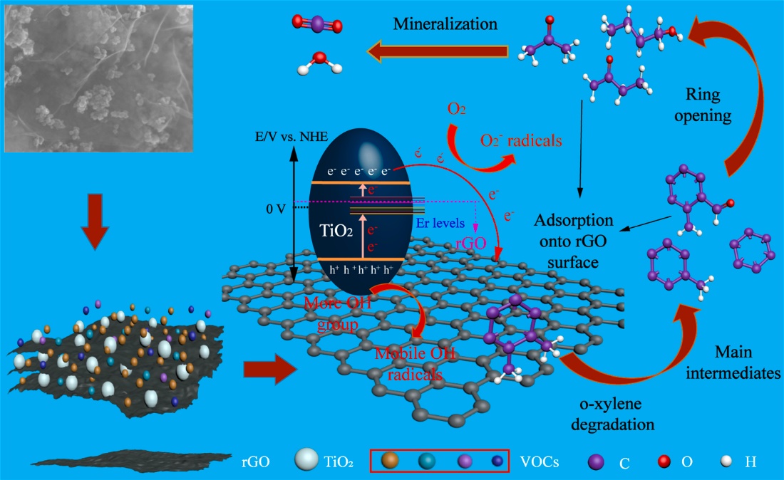 该团队采用 “两步法”制备出光催化剂rGO/Er3+-TiO2,此复合光催化剂对气相邻二甲苯(<100 ppm)展现出高效的光催化性能以及优异的稳定性,对25ppm的邻二甲苯的降解效率达100%,反应40 h后无明显失活现象。而对比样TiO2和Er3+-TiO2样品光催化反应60 min后明显失活。导致催化剂失活的主要原因是中间产物累积在催化表面,占据了反应活性位点。该研究首次揭示出rGO的引入不仅为气体污染物的吸附提供了更多空间,而且为中间产物提供了额外的吸附位点,从而保证了催化剂本征的反应活性位点的充分暴露,使其具有长效的光催化活性。上述结果对光催化剂的失活和活化机理提供了新的认识,同时也为解决光催化材料在降解VOCs过程中一直面临的失活问题提供了解决策略。