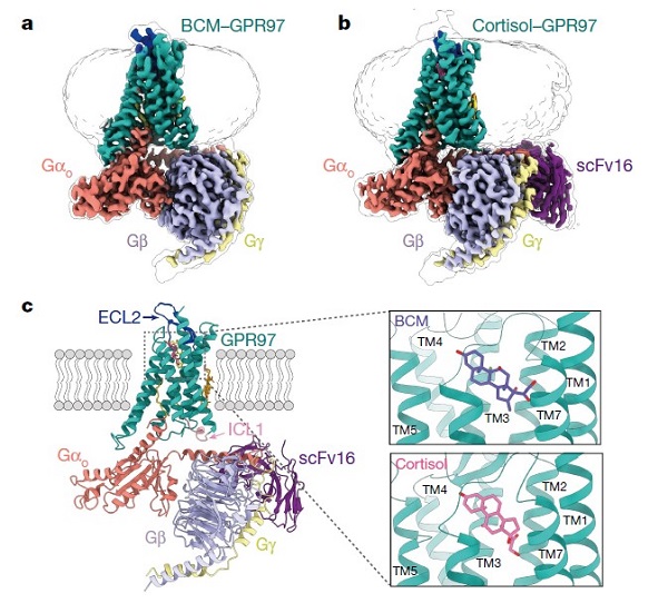 在前期工作的基础上,联合团队采用单颗粒冷冻电镜技术,分别对外源配体倍氯米松(BCM)以及内源性配体氢化可的松(cortisol)激活GPR97后形成的复合物进行了结构解析,最终分别获得了两个配体激活态的GPR97受体与Go蛋白的复合物结构,分辨率分别为3.1埃和2.9埃(图1a和1b)。