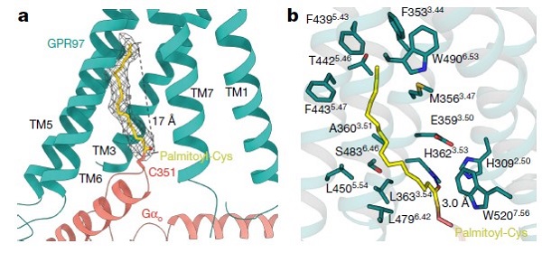 相对其它GPCR亚家族成员,GPR97的7TM呈现独特的空间分布,其螺旋也展现出与其它受体不同的长度;根据传统理论,aGPCR特有的胞外GAIN结构域和7TM在激活GPCR的过程中作为整体发挥其核心功能,然而,研究人员在结构中首次发现糖皮质激素结合在GPR97 7TM核心中的一个椭圆形正构结合口袋(图1c);此外,GPR97展现出不同于其他A类GPCR成员的独特激活机制。GPR97序列中不含有保守的PIF、DRY和NPxxY等motif,其首先通过toggle switch W6.53 识别配体并被激活。激活的受体借助首次发现的upper Quaternary core(UQC)将受体TM3-TM5-TM6捆绑在一起,继而通过HLY motif介导与Go蛋白的结合。受体7TM组成较大的胞内侧G蛋白结合口袋,3个胞内环都参与了受体与G蛋白的相互作用,胞内环与受体的组成性激活密切相关;在本项研究中,研究人员还首次阐述了G蛋白的棕榈酰化修饰在其偶联GPCR中的关键作用。研究首次发现Gαo的α5螺旋C351位点被棕榈酰化修饰(图2),并进一步验证了该修饰在Go与GPR97的偶联中的独特作用。