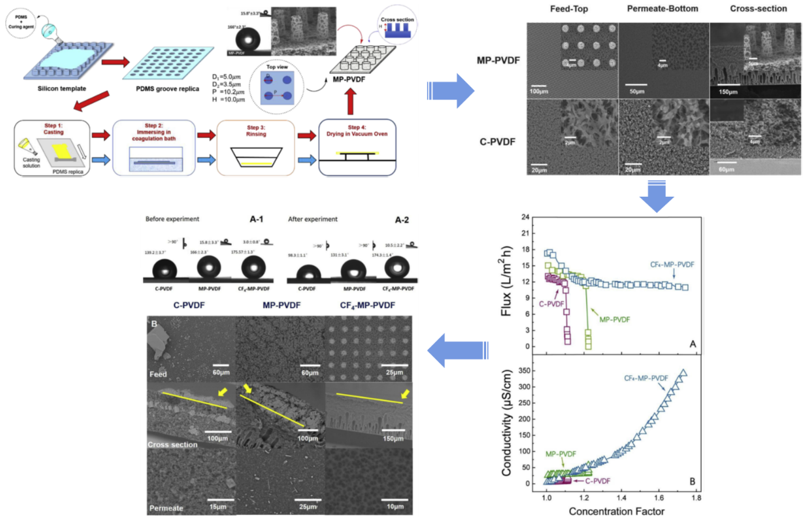 1.采用微模塑相分离方法设计了一种超疏水聚偏氟乙烯(PVDF)微米柱阵列膜(MP-PVDF),膜的接触角为166.0o,滚动角15.8o。经过四氟化碳(CF4)等离子体处理后,所得膜(CF4-MP -PVDF)的滚动角减小到3.0o,表现出优异的疏水性和耐结垢性能,通过热力学分析得出矛盾,从水力学角度出发,提出润湿状态在耐结垢方面的重要作用。相关成果以“Slippery for scaling resistance in membrane distillation: A novel porous micropillared superhydrophobic surface”和“Scaling mitigation in membrane distillation: From superhydrophobic to slippery”为题分别发表在Water Research 和Desalination上。(图1和图2)