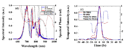 脉冲测量是飞秒激光脉冲产生和应用的必要前提,FROG方法自1993年提出来,已成为最广泛应用的脉冲完全测量方法之一,被证明是一种准确的测量方法,不受脉冲的复杂性以及所携带的啁啾情况影响,能以多发、单发模式运行,并且具有快速收敛的相位重建迭代算法。SRSI方法自2010年提出后,也得到了深入的研究和广泛应用,其单发以及支持宽光谱测量的特性,使得该方法在脉冲的实时监测、单发测量、反馈控制和优化等应用中获得了广泛使用,然而该方法基于光谱干涉的特性,使得其不能对高啁啾脉冲进行测量。研究小组通过瞬态光栅效应,巧妙的将两种测量方法结合在一起,提出了FASI的测量方法并推出测量装置,装置能对压缩好的从紫外到中红外的周期量级的脉冲利用SRSI进行单发测量,还能对高啁啾脉冲进行FROG多发扫描测量,并在研究中分别对中心波长为800nm和1800nm的周期量级脉冲进行了测量,证明了测量装置的可靠性。