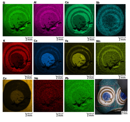 此前,本中心曾与河南省文物考古研究院,复旦大学合作,对淅川徐家岭战国早期楚墓出土的一批域外输入的钠钙硅酸盐蜻蜓眼玻璃珠进行了初步分析,近期又对其进行了深入研究。这批玻璃珠为典型东地中海风格的泡碱型钠钙玻璃,使用了层叠工艺和多种着色剂,深蓝色眼珠、棕色条带、蓝色基体分别采用了Co、Fe和Mn、Cu离子着色,而白色眼圈使用了锑酸钙(CaSb2O6)晶体化合物作为着色剂和乳浊剂。这与曲阜鲁国故城出土的蜻蜓眼玻璃珠在化学成分体系、装饰风格、着色工艺等方面存在明显差异。此类钠钙玻璃体系的蜻蜓眼玻璃珠于春秋末战国初(约公元前5世纪中叶)经丝绸之路传入我国内地,深受当时王公贵族们的喜爱,这在一定程度上刺激了本土玻璃的起源,我国古代工匠们很快采用本土配方和工艺进行仿制和创新,创造出铅钡釉砂、铅钡玻璃、铅钡釉陶、钾钙釉砂和钾钙玻璃等多种质地、多种器形、更为精美的蜻蜓眼珠品种,“青出于蓝而胜于蓝”,是中国古代工匠精神的一个缩影。