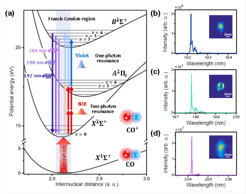 图1 (a) DUV/VUV光源产生原理图;(b)-(d) 不同波长DUV/VUV辐射的光谱和光斑分布。