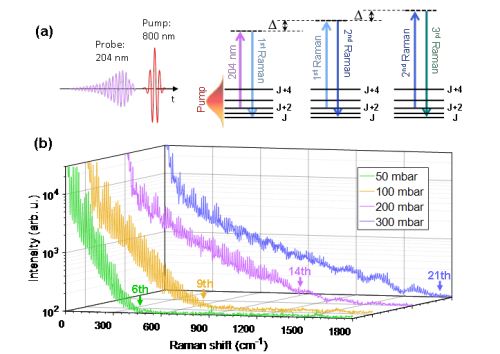 在这项研究中,科研人员利用近红外和紫外双色泵浦光实现CO+能级间的共振激发,进而产生量子相干增强的DUV/VUV辐射。由于CO+包含丰富的振动能级,通过调节紫外泵浦激光的波长,便可以产生不同波长的DUV/VUV 相干辐射。通过改变紫外泵浦光的偏振,还可以对DUV/VUV 辐射的偏振进行灵活控制。另外,飞秒泵浦脉冲与皮秒DUV/VUV辐射的结合在相干拉曼散射中展现出显著优势。科研人员利用DUV/VUV光源的高光谱分辨能力,以及飞秒泵浦脉冲能够制备相干转动波包的优势,在氧气中产生了DUV/VUV拉曼梳。该研究为台式化 DUV/VUV 光源的产生以及相应的光场调控技术提供了新思路。
