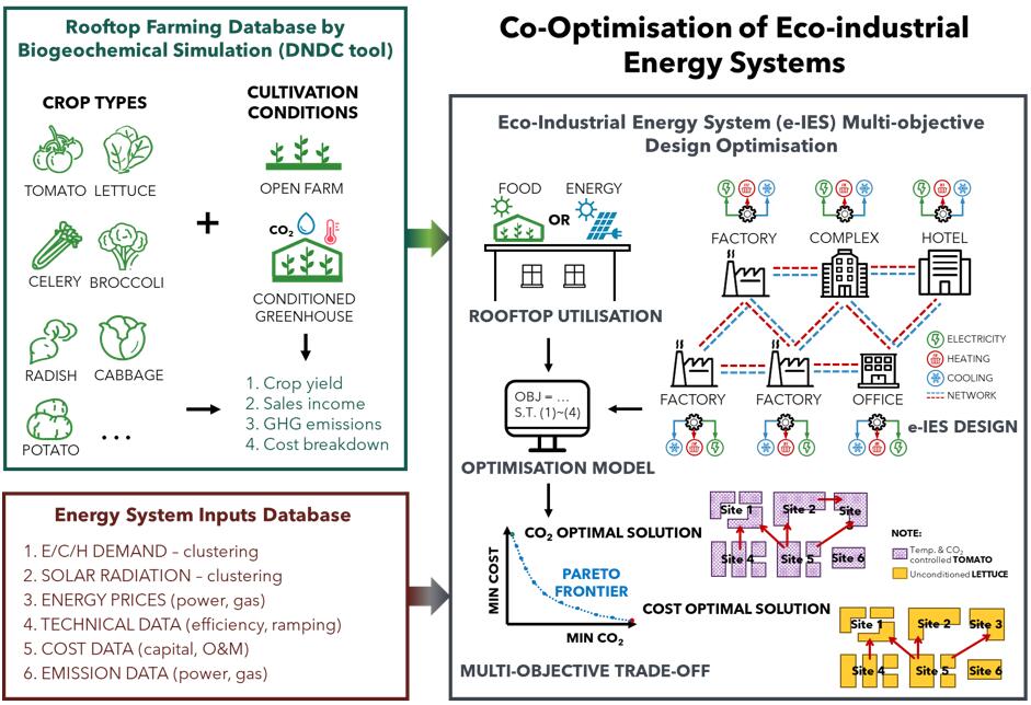 工业部门能耗约占全球30%,其通常被视作减排的难点,需采用系统性的思维(system thinking)和综合的方法实现减排。本研究提出一种生态型工业综合能源系统的理念,充分利用工业厂房屋顶进行种植并与综合能源系统耦合,提供一种基于数学优化的生态型工业能源系统评估框架,实现农业与能源耦合系统(Food-Energy-Nexus)的协同优化与最优决策。现阶段能源系统与农业生态系统研究之间尚缺少足够的关联,而本研究亮点在于实现了两个领域的交叉耦合,通过生物地球化学模拟工具(DNDC)模拟7种作物在10种种植方式下的生长过程,构建详细的屋顶农业生产数据库,再将模拟结果输入生态型工业能源系统优化模型进行协同优化。通过一个生态型综合能源系统在工业园区的应用案例研究可知:与空置屋顶相比,在工业园区屋顶种植蔬菜可节约5.6%综合成本,并减排16.3%。这意味着屋顶种植是一种具有经济与环保潜力的屋顶利用选项。