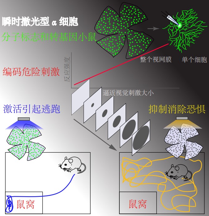 通过筛选分子标志物和构建转基因小鼠,可以标记并操纵瞬时撤光型α视网膜神经节细胞(上)。当给予逼近视觉刺激时,此类细胞可以编码逼近视觉刺激的大小(中)。通过光遗传学的方法激活此类细胞,可以引发小鼠逃跑到安全地方的本能防御行为(左下),而抑制此类细胞的活动时,哪怕给予危险的逼近视觉刺激,小鼠仍然正常的活动(右下)。