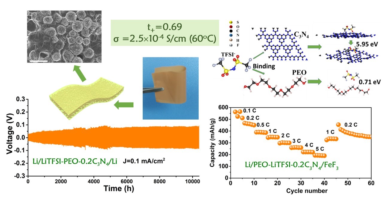 最近,中国科学院上海硅酸盐研究所李驰麟研究员团队研制出聚合增强型的锂氟转换全固态电池。该团队通过“硬质”C-N聚合物(g-C3N4)介孔微球堆垛填充策略,不仅加强了“软质”PEO聚合物电解质的机械性能和对锂负极的形变抑制(锂金属对称电池至少1万小时的超长沉积/剥离循环),而且通过C-N微球的超薄二维纳米片单元与聚氧化乙烯基质和锂盐(LiTFSI)中阴离子的多尺度成键交联,构建出具有“渗流效应”的丰富高导界面,提高了复合电解质的离子导电率(60℃时为2.5×10-4S/cm)、锂离子迁移数(高达0.69)和高电压稳定性(可承受三元层状氧化物正极的稳定循环)。g-C3N4/PEO复合电解质表现出高的机械强度,并且维持了优异的柔韧性(可弯曲180度),可实现薄至25微米的薄层膜制备。FeF3-聚合物的软界面紧致接触,实现了氟基正极循环过程中转换反应产物的空间限域和溶解抑制效应,可赋予全固态Li/FeF3电池在5C大倍率下仍有200mAh/g的大容量释放,1C下可循环至少1200次,其赝电容贡献和扩散系数分别高达55%和10-12cm2/s。该成果突破了转换型全固态电池的高倍率性能瓶颈,为发展高安全、高能量密度的柔性氟基固态电池提供了新的技术方向。相关成果发表在Science Bulletin 2021,66,694-707上。