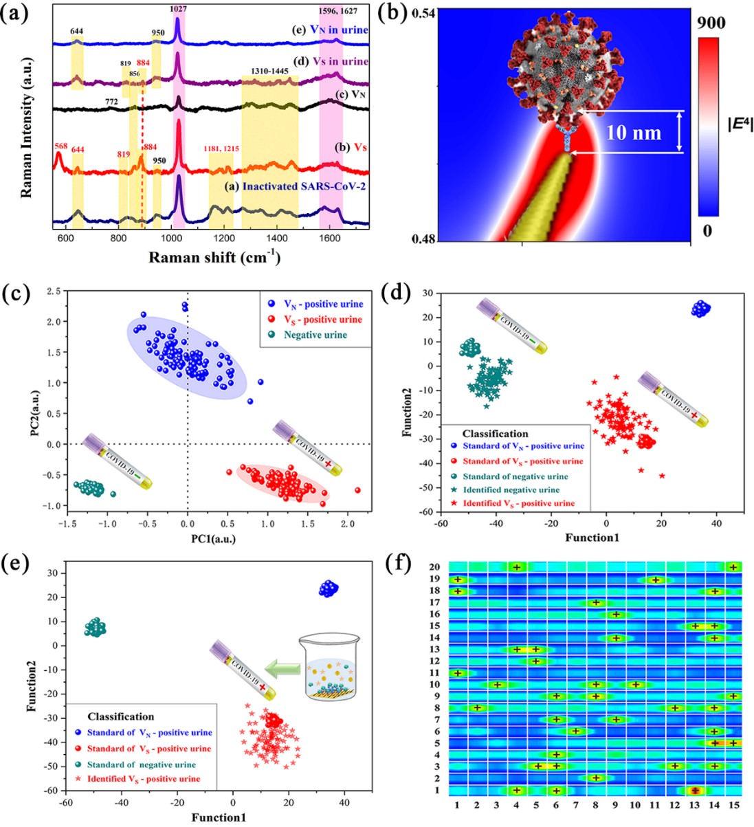SERS生物传感器检测灭活新冠病毒的标准Raman图谱(a)和SERS增强机理图(b);新冠病毒Raman光谱机器学习判定标准及实际检测结果图