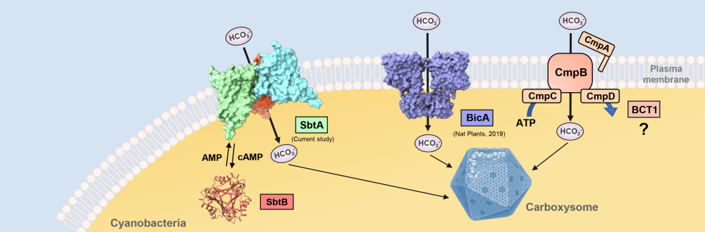 随着工业化的进程,CO2等温室气体的排放给人类赖以生存的环境带来了挑战。应对这一挑战的重要策略之一是利用植物及其他光合生物的光合作用实现“碳中和”。植物和藻类体内存在浓缩CO2、提升光合效率的工作机制。其中,蓝藻为了适应低CO2的环境,进化出了特殊的CO2浓缩机制 (CO2 concentration mechanism, CCM)。CCM由五种不同的无机碳摄取系统和羧酶体构成。其中,BicA、SbtA和BCT1是CCM中三种重要的HCO3-转运蛋白(图 1)。BicA是一种高通量的Na+依赖型HCO3-转运蛋白。在前期研究中,张鹏研究组报道了BicA的结构与跨膜转运机制(Nat Plants, 2019)。本研究的关注对象SbtA是一种高亲和力、低通量的Na+依赖型HCO3-转运蛋白,其活性受到PII信号转导超家族成员SbtB蛋白的别构调控。然而,人们对SbtA的跨膜转运过程和别构调控缺乏了解。