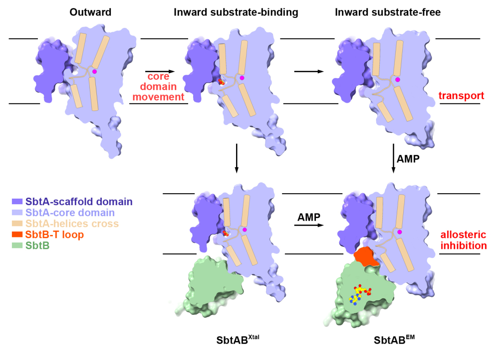 图2 SbtA的跨膜转运与别构调控的分子模型