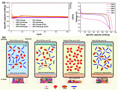 图1 (a)使用AE电解液的Li/LFP电池在不同温度下的电池性能,(b)宽温度LIBs的AE电解质中ADN分子平衡溶剂和电解质的竞争分解示意图