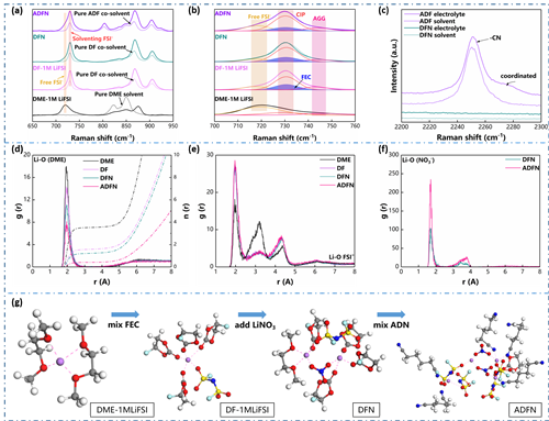 图2 不同电解质的溶剂结构。(a-c)不同电解质的拉曼光谱范围为650~950cm-1(阴离子和溶剂),700~760 cm-1(FSI-和FEC),2200~2300cm-1(ADN分子的C-N伸缩振动峰);(d-f) 温度为303K时进行MD计算的不同电解液的径向分布函数:Li-ODME、Li-OFSI-和Li-ONO3-;(g) 不同电解液中的典型溶剂化结构(Li+,紫色;O,红色;C,灰色;H,白色;N,蓝色;S,黄色;F,浅蓝色)