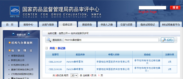 2021年6月2日,1类新药PA9159注册申请获得药物临床试验申请(IND)默示许可。PA9159的注册申请于2021年3月12日由CDE受理,适应症为季节性和常年性过敏性鼻炎。