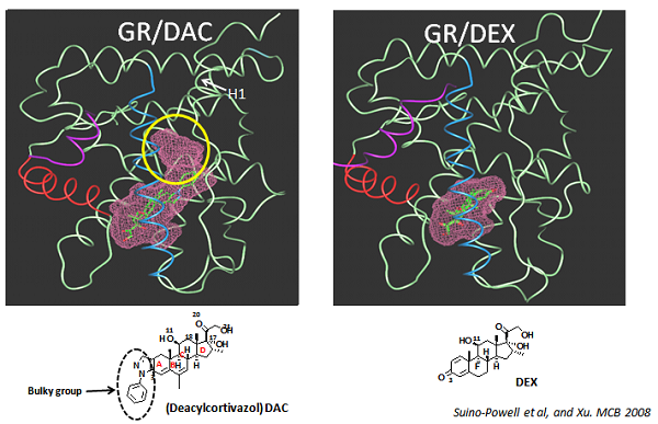 2008年,徐华强团队在前期研究基础上又获得了糖皮质激素类药物脱酰可的发唑(DAC)和地塞米松(DEX)与GR复合物的高清晰蛋白结构。