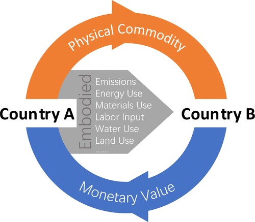 图1 国际贸易中产生的直接流(实物商品和货币价值)和间接流(能耗、排放等)