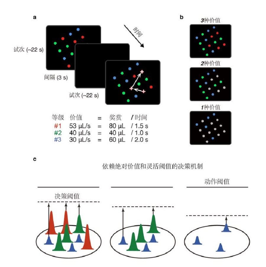 (a)多选项眼动觅食实验的任务示例。这个4×4视觉刺激阵列是由3种颜色的目标组成的。每种颜色代表一定大小的价值。价值大小的定义是给果汁量除以获得该奖赏所需的注视时间。当猕猴将眼睛移动到某个目标并注视相应时间,目标颜色就会变成灰色,猕猴会获得相应的数量的果汁。在此例中,目标价值按照红色到绿色再到蓝色的顺序递减。在任务中,颜色和价值之间的关联保持不变,但在阵列中颜色点的位置是随机的。 (b) 在此示例任务中,随着猕猴的一系列选择,高价值的目标越来越少。由上至下,红色目标首先被选完,然后是绿色,最后只剩下低价值的蓝色目标。(c)上丘决策的机制示意图。每个峰代表一个神经元,峰的高度代表神经元的活性,颜色代表神经元所表征的目标的颜色。虚线则为决策阈值,实现代表动作阈值。神经元有稳定的价值表征,灵活的决策阈值和固定的动作阈值。某一颜色的价值表征大小不随其他选项变化,而决策阈值是由各选项总体的价值所决定。(左)任务开始时,由于红色目标价值较大,相应神经元的活性较高,更有可能达到决策阈值。(中)红色目标被选完后,决策阈值被调低,绿色的神经元胜出的可能变大。(右)只剩蓝色选项的时候,阈值更低。