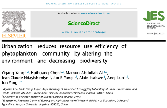 研究结果以Urbanization reduces resource use efficiency of phytoplankton community by altering the environment and decreasing biodiversity为题发表于生态环境领域国际期刊Journal of Environmental Sciences, 2022, 112, 140-151。中国科学院城市环境研究所硕士研究生杨义刚为第一作者,杨军研究员为通讯作者。该研究得到了中国科学院战略性先导科技专项、国家自然科学基金和福建省自然科学基金等项目的资助。