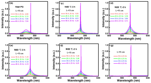 (b-f) fiber-PG光纤和在不同热处理温度下光纤的光谱图;(g) 空白对照:无纤芯光纤的光谱图