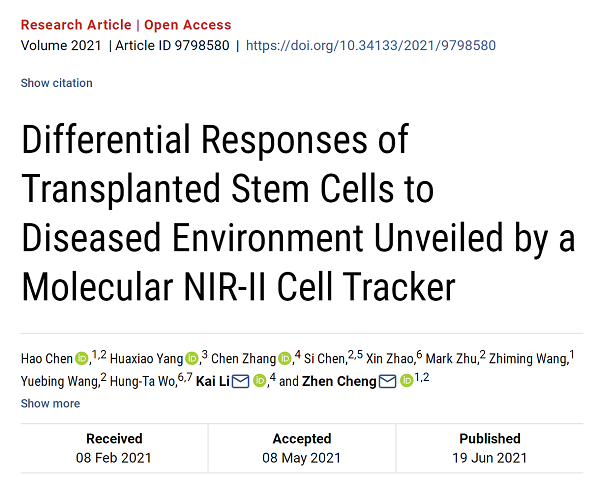 近日,中国科学院上海药物研究所分子影像中心程震、陈浩团队与南方科技大学李凯副教授课题组合作,设计出基于NIR-II小分子染料蛋白复合物的干细胞示踪剂(CelTrac1000),用于标记并示踪干细胞在不同疾病环境中的响应和命运。CelTrac1000使用可代谢的NIR-II小分子染料(CH-4T)与穿膜肽(Tat)修饰的人血清白蛋白 (HSA)1:1复合而成,形态类似于上市药物紫杉醇白蛋白(Abraxane等),具有制备生产精确可控、量子产率高、毒性低和可代谢等优点。相关成果于2021年6月19日发表于Research期刊。