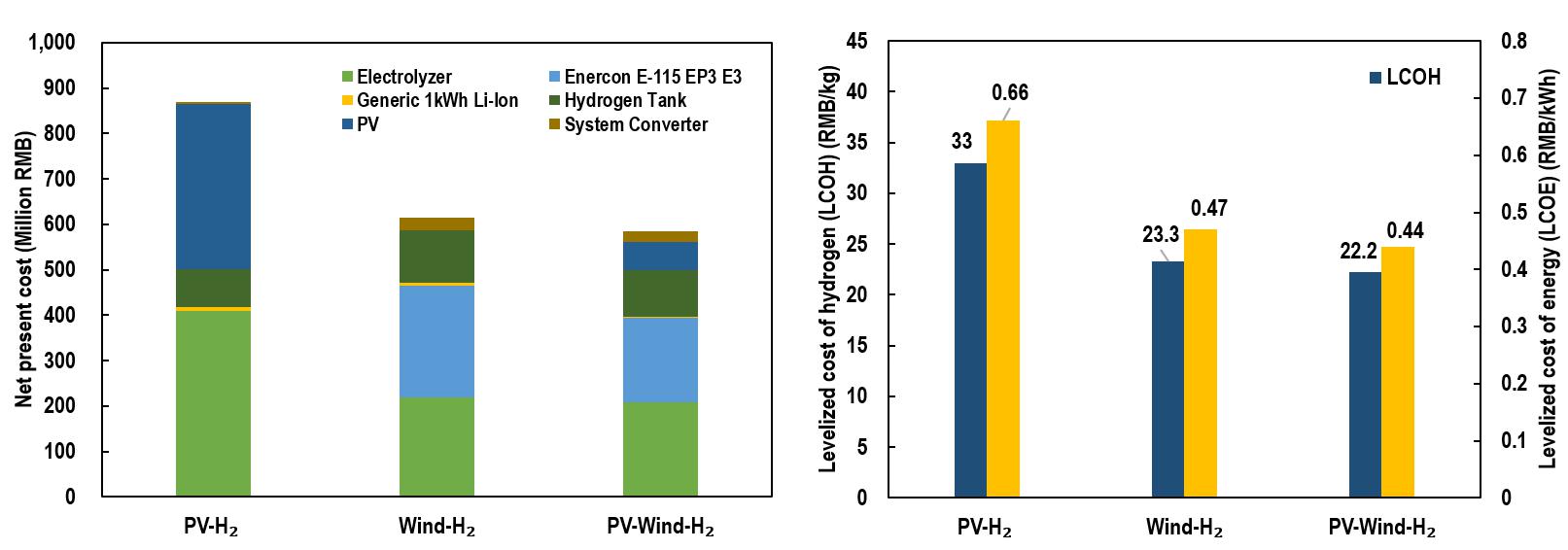 在我国提出碳达峰和碳中和目标的大背景下,利用可再生能源将二氧化碳转化为甲醇已引起广泛关注。该路线利用可再生能源电解水制取氢气,再利用二氧化碳加氢技术生产绿色甲醇。然而,在将可再生能源系统与化工生产过程耦合时,化工系统持续稳定的氢气需求与可再生能源系统的间歇性和波动性之间存在矛盾。因此,考虑上游可再生能源制氢系统的设计与优化,以更好地匹配下游需求,对于整个绿色甲醇系统的实现至关重要。基于此,研究团队以位于青海的10kt/a的绿色甲醇厂为基准,设计并优化了三种不同的可再生能源供氢-供电系统为整个绿色甲醇厂提供稳定的氢气和电力,分别为:风-储、光伏-储、风-光-储微电网供能供氢系统。