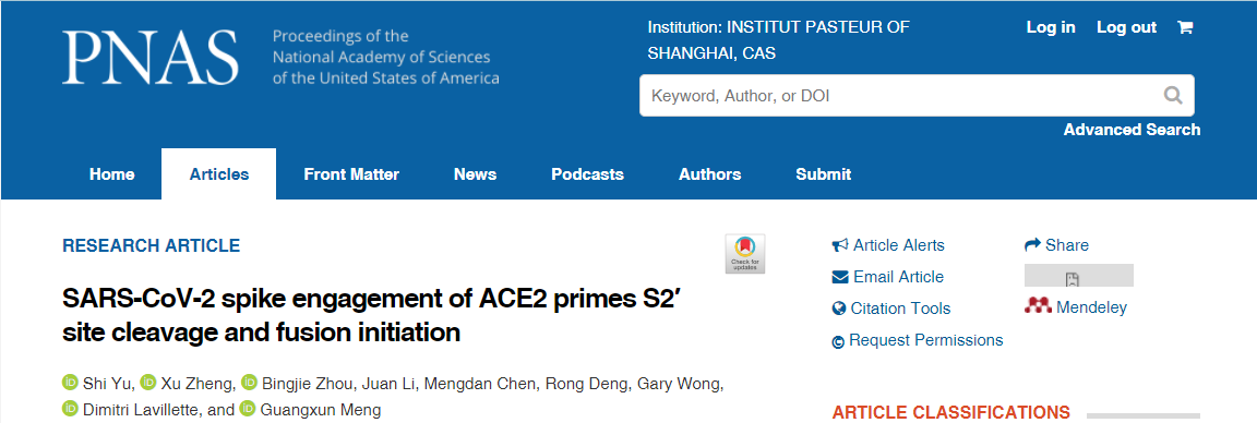 12月21日,中国科学院上海巴斯德研究所孟广勋组和Dimitri Lavillette组合作在国际学术期刊《美国国家科学院院刊》发表了研究论文SARS-CoV-2 spike engagement of ACE2 primes S2’ site cleavage and fusion initiation。