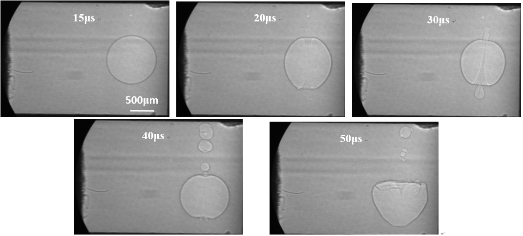 图2 单脉冲X射线超快成像在激光加载后不同时刻(15μs, 20μs, 30μs, 40μs, 50μs)获得的水中气泡的瞬态图像并观测到气泡中的射流现象