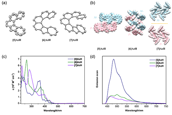 图2 (a) 嵌薁[n]螺烯的单晶结构; (b) 分子堆积结构; (c) 紫外-可见吸收光谱; (d)发射光谱