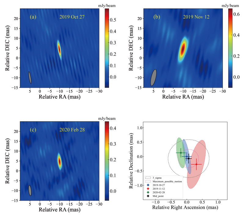 图1.(a)-(c)为目标源的三次高分辨率观测数据的成图结果。可以看出,目标源在EVN观测中仍呈现为未分辨的致密结构。每一个图像左下角为相干图像的波束形态(beam),目标辐射区域与beam形态越接近说明目标源越致密;右下图为三次观测中辐射区域绝对位置的测量结果,显示了三个历元中目标辐射区相对位置的变化情况。彩色棱形点和十字线代表了每次观测的位置及其测量误差值,其外部的椭圆代表了每次观测的beam形态。黑色棱形点和十字线代表了三次观测中辐射位置的中位数及其误差。红色圆虚线代表了综合三次测量结果所得到的目标源位置的最大可能变化范围,黑色圆虚线为所测得目标源位置的三倍误差范围,科学研究中通常以此来显示测量结果的可靠程度,这些测量结果是估算外流速度的重要依据。